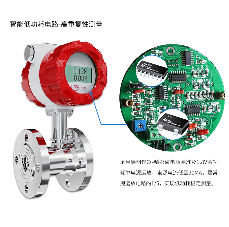 流體流經傳感器殼體,由于葉輪的葉片與流向有一定的角度,流體的沖力使葉片具有轉動力矩,克服摩擦力矩和流體阻力之后葉片旋轉,在力矩平衡后轉速穩定,在一定的條件下,轉速與流速成正比,由于葉片有導磁性,它處于信號檢測器(由永久磁鋼和線圈組成)的磁場中,旋轉的葉片切割磁力線,周期性的改變著線圈的磁通量,從而使線圈兩端感應出電脈沖信號,此信號經過放大器的放大整形,形成有一定幅度的連續的矩形脈沖波,可遠傳至顯示儀表,顯示出流體的瞬時流量或總量。