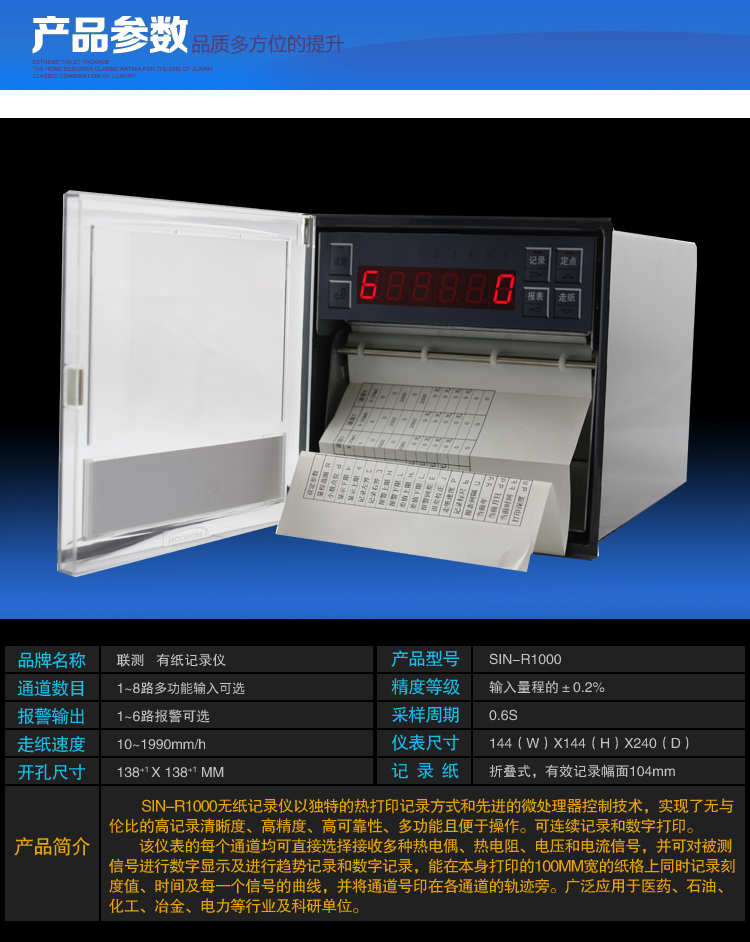 SIN-R1000有紙溫度記錄儀最多具有8路輸入通道,2路模擬量輸出,通道之間采用點點隔離;均可直接選擇接收多種熱電偶、熱電阻、壓力變送器、電壓、電流信號